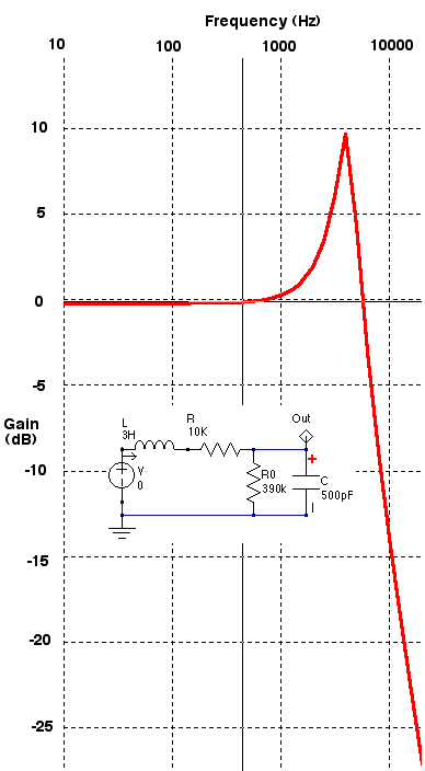 Terry: I just looked at your notes in a little more detail. While the actual capacitance shown as a shunt is the sum of the pickup bypass cap (which I think is used to make the pickups "brighter"), the distributed capacitance of the cable, and the amplifier input, since they all act in parallel, the net rollof is still 6 dB/octave without the inductance and 12 dB with it. The Thevenin equivalent circuits have the same overall topology, I believe, whether the capacitance is physically distributed or not.One thing this exercise has taught me is that the actual guitar cable is a big deal. Belden 8410 is unusually good stuff - better, I think, than you can expect in many commercial cables - I have seen 100 pF/foot often. Changing the length from 15 to 6 feet can mean the difference between having nice brilliant highs and having weak signal from the 24th fret. The models that I used are clearly simplified, though. For example, the pickups themselves are not simple inductors but have distributed parallel capacitance and series resistance that will greatly alter the peakiness present in the plots above. Anyone tried my circuit yet?