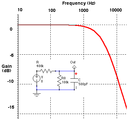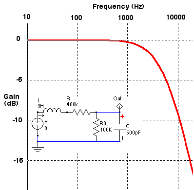 Jack, when I was referring to "professional equipment", I meant that you probably have components that solve this problem for you. The Lawrence pickups are probably low impedance and you Transtube (I thought that is what you use) probably has a very high input impedance like 1Mohm. A typical steel pickup is likely a higher impedance than the Lawrence and a Peavey combo type amp will often have a 220K input resistor with 100pF for RF shunting. Another good example is my Telecasters. If I play them directly into my Twin, the absence of a trebly bypass capacitor makes it real muddy turned down. If I play through my wireless transmitter (1Mohm), I don't need the treble bypass at all.Mark, what you are getting across is true, but to further support your conclusion, it is actually worse than you are showing. Your model only show a series inductor, resistive divider, and a shunt cap. The cable has a distributed capacitance in addition to the amplifer input RF bypass capacitor. This changes the circuit from a 12dB/octave network to an 18dB/octave network. If you modeled the 500pF as the total capacitance of the cable and the amp input, your breakpoint is probably about the same, but the rolloff rate would be even sharper than you modeled. I think it comes down to the simple fact that some combinations of pickups and amps will not be affected noticeably by passive volume pedal changes, but others will definitely have a noticable effect. |
